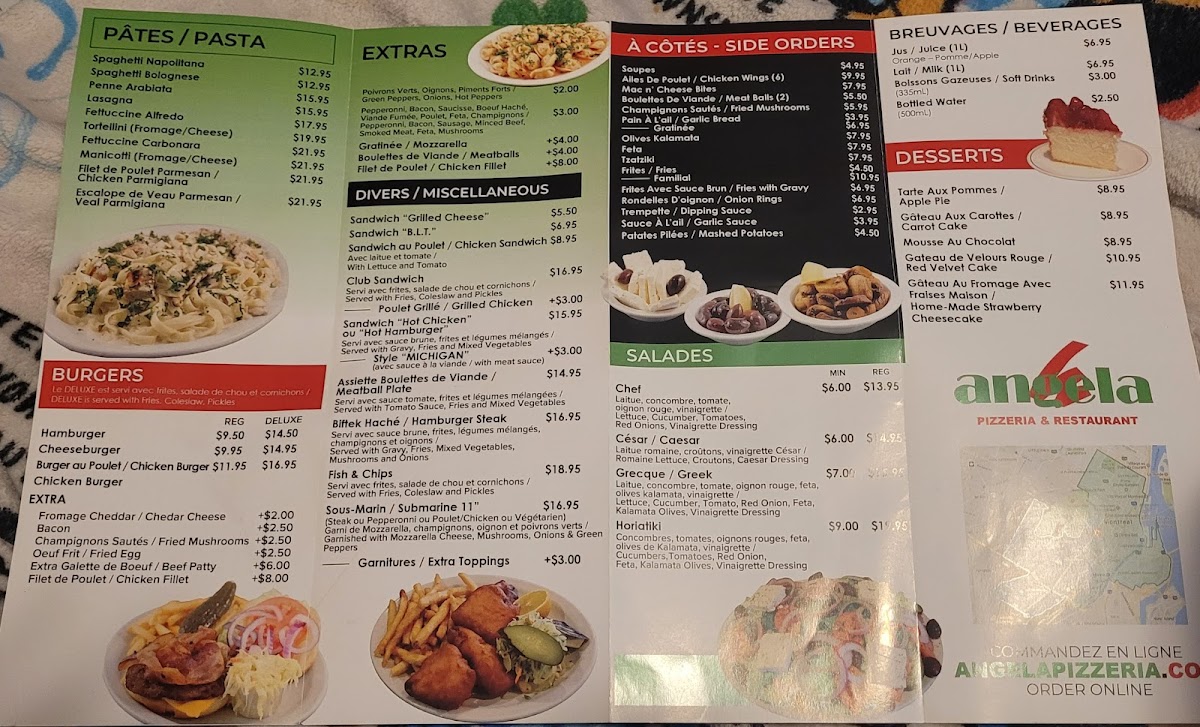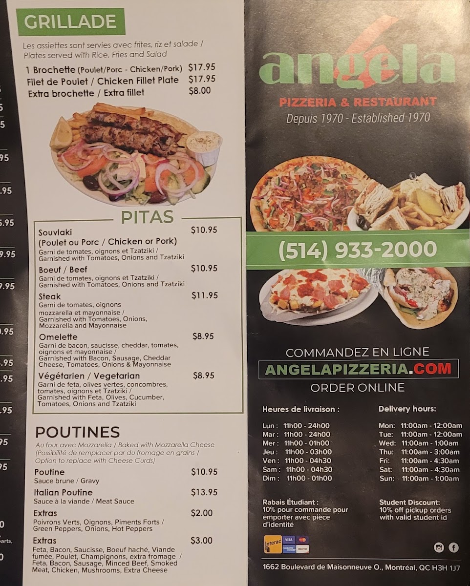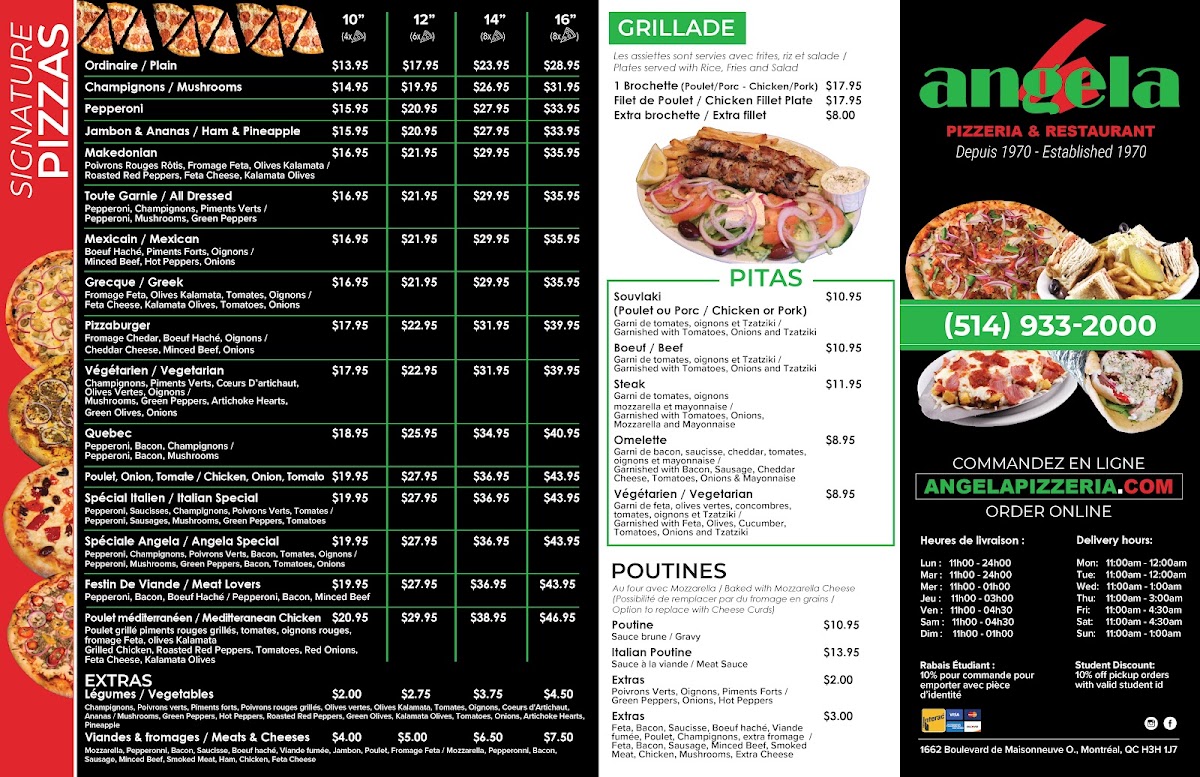 Welcome to Angela Pizzeria & Restaurant, located at 1662 Boulevard De Maisonneuve in Montréal, Québec. This cozy restaurant offers a wide range of delicious dishes that will satisfy any craving.