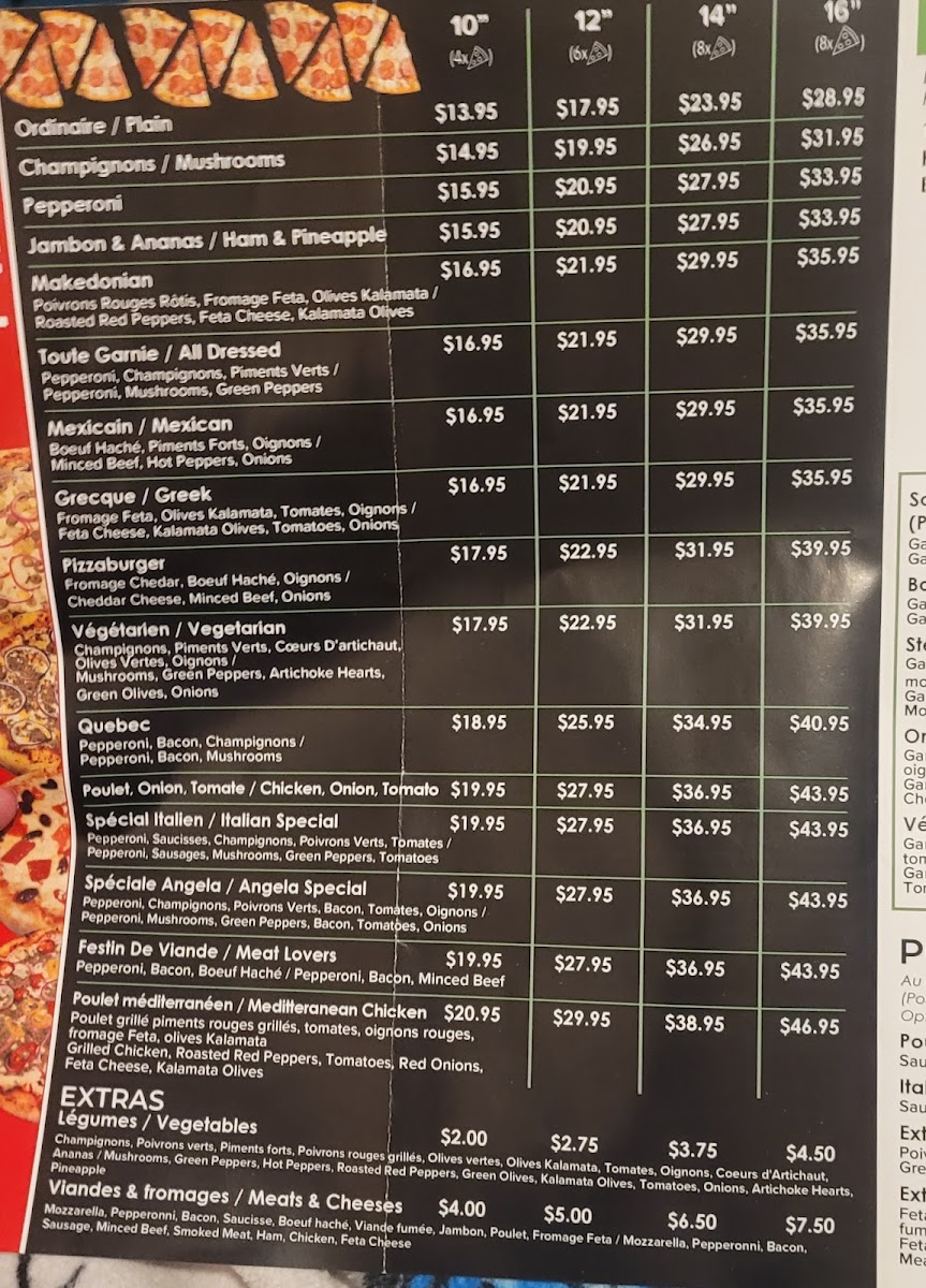 From their mouth-watering pizzas like the Vegetarian Pizza, Angela Special Pizza with pepperoni, mushrooms, green peppers, bacon, tomatoes, and onions, to their flavorful Pasta selections such as Veal Parmigiana and Fettuccine Carbonara, there is something for everyone.